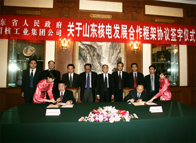An outline co-operation agreement for jointly promoting nuclear power development in Shandong was signed between the president Kang Rixin of CNNC and the provincial governor Han Yuqun of Shandong Province on the afternoon of Oct. 9.